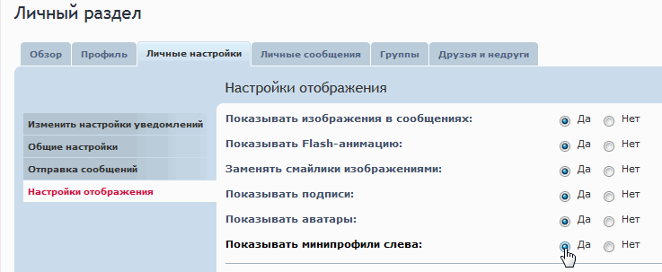 Расширение позволяет переключится на лево/правостороннее расположение минипрофилей в личном разделе и/или со страниц тем
