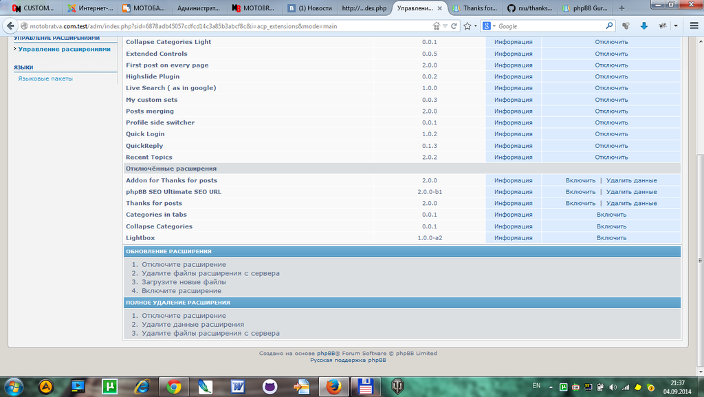 В таблице phpbb_ext поля gfksx/ThanksForPosts и alg/AddonForThanksForPosts в графе ext_active с каким значением?