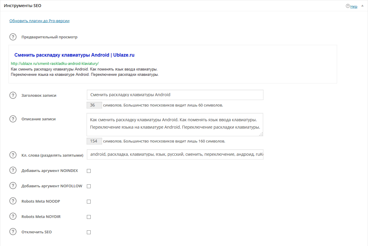 Так же можно ввести описание и ключи, причем сразу видно, как это будет выглядеть в ПС. и конечно же есть canonical url