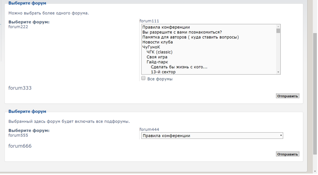 Начинаешь набирать название форума, получаешь список. выбор из списка производит то же действие, что кнопка "отправить". Т.е. выбор из верхнего текстбокса вернёт вам выбранный форум, а из нижнего - форум вместе с его иерархией