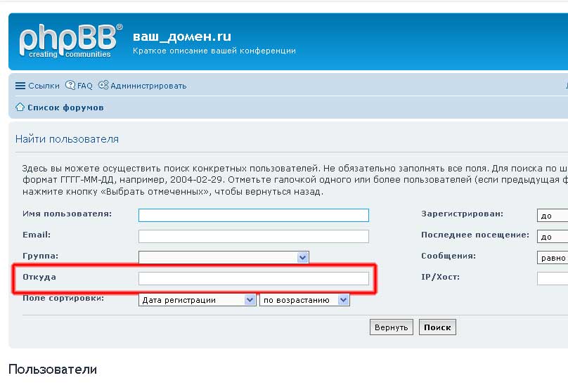 Как добавить строку на странице поиска пользователей, например, чтобы было так 4. Ну а тут совсем ничего не понимаю. Как добавить новый аргумент поиска в Поиске пользователей, например добавить поиск по полю user_from ? Чего, куда и как - темный лес...